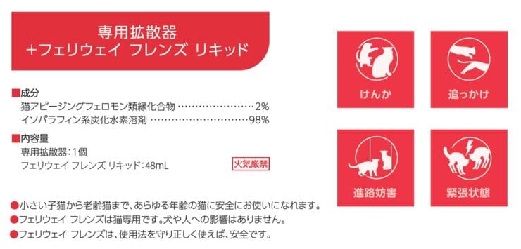 一緒に暮らしている猫どうしのケンカや緊張をやわらげ、おうちで穏やかに過ごせるようサポートする拡散器製品です。