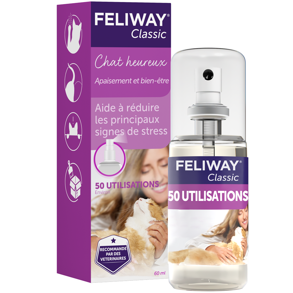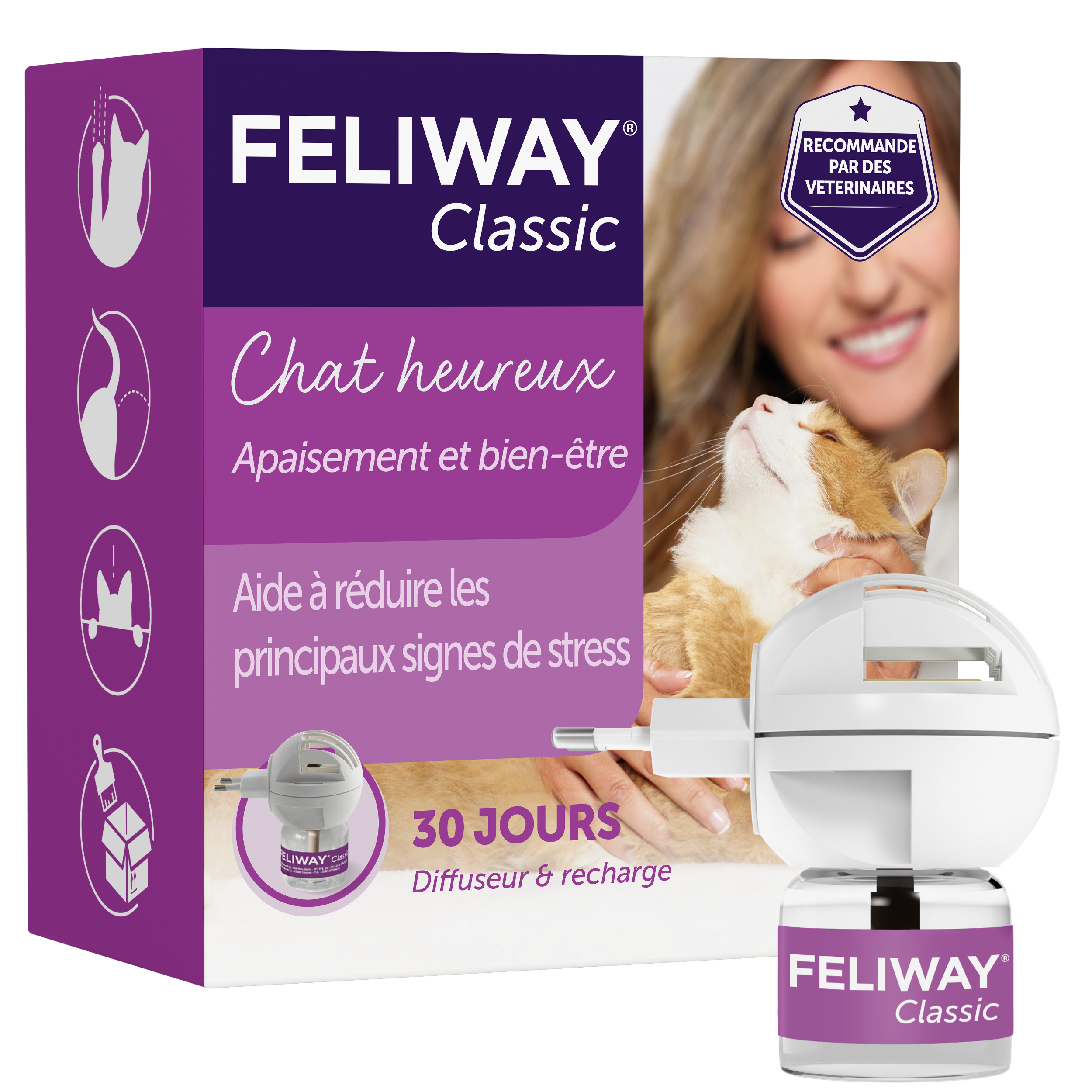 FELIWAY Classic doğal ve güven verici mesajları kullanarak kedinizin mutlu bir şekilde modern yaşamın hızına uyum sağlamasına yardımcı olur, idrar püskürtme, tırmalama ya da saklanma gibi davranış bozukluklarını gidererek tekrar mutlu olmasını sağlar.